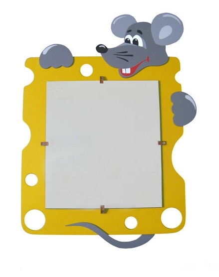 Настенное зеркало оснащено противоударной пленкой. Корпус украшен деталями в виде мыши и сыра. На оборотной стороне есть планки с металлическими навесами.