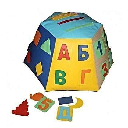 Напольная игрушка с цветными гранями дополняется съемными аппликациями. На них изображены цифры, буквы, насекомые, городские и природные объекты. Ребенок научится считать, выучит названия предметов, сможет классифицировать их по признакам. Полусфера поставляется вместе с застежками и шнуровками для тренировки мелкой моторики.