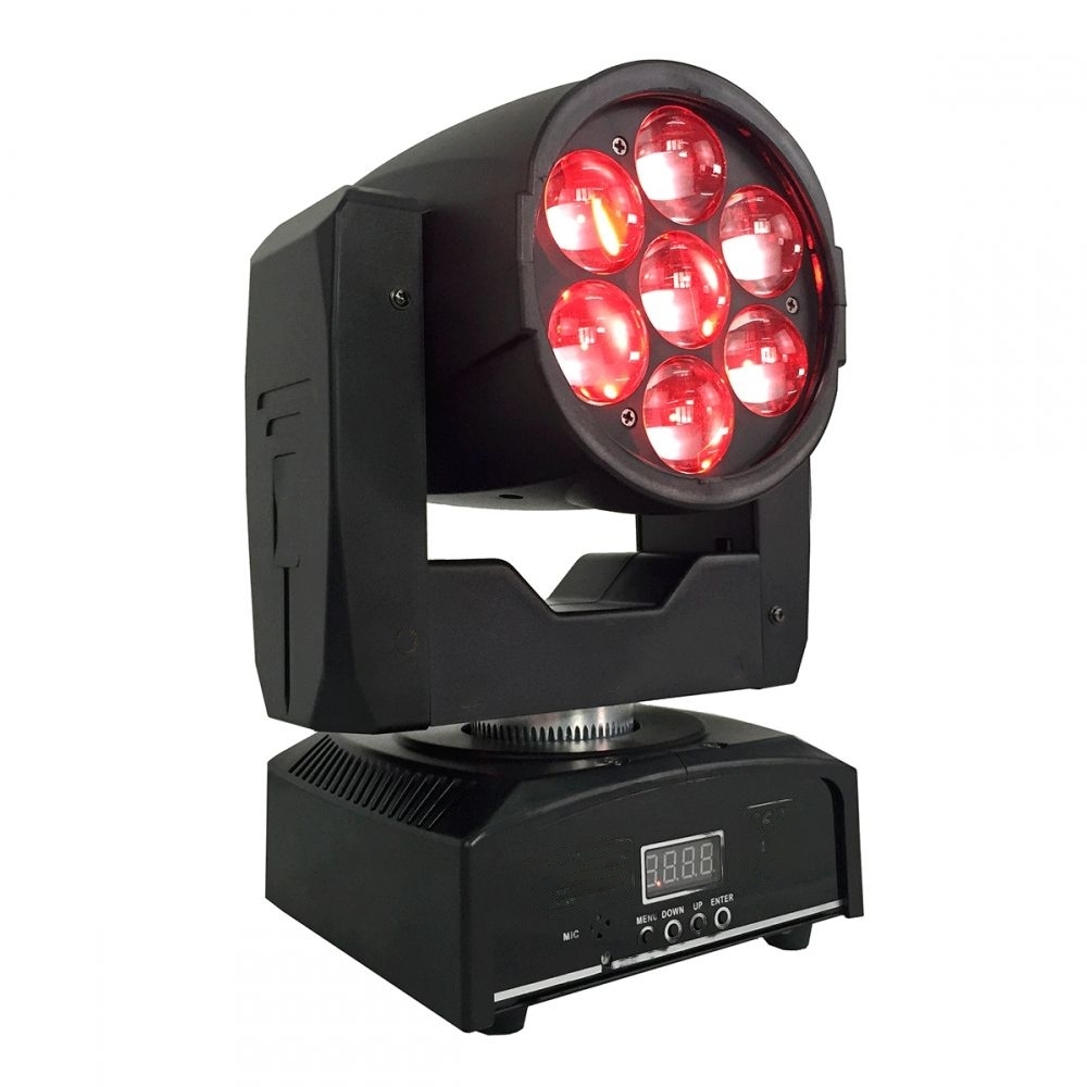 Прожектор с изменяемым углом раскрытия формирует лучи для заливки сцены или дискотечных эффектов. Источниками света служат 7 светодиодов по 15 Вт.