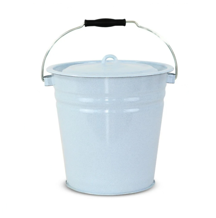 Ведро с крышкой и ручкой подходит для столовой. Внутри хранятся и переносятся пищевые продукты. Корпус цилиндрический, без рисунка, покрыт эмалью. Металлическая ручка дополняется накладкой-держателем.