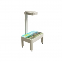 Проекционная техника передает картинку на рабочее поле (столешницу / резервуар с природным материалом). Игровая площадь составляет 0,7 кв.м. Датчик распознавания объема считывает касания предметами (например, кубиками из дерева). Если используется песок, его можно сдвигать в разные стороны, пересыпать между пальцев. При этом изображения виртуальных объектов смещаются.