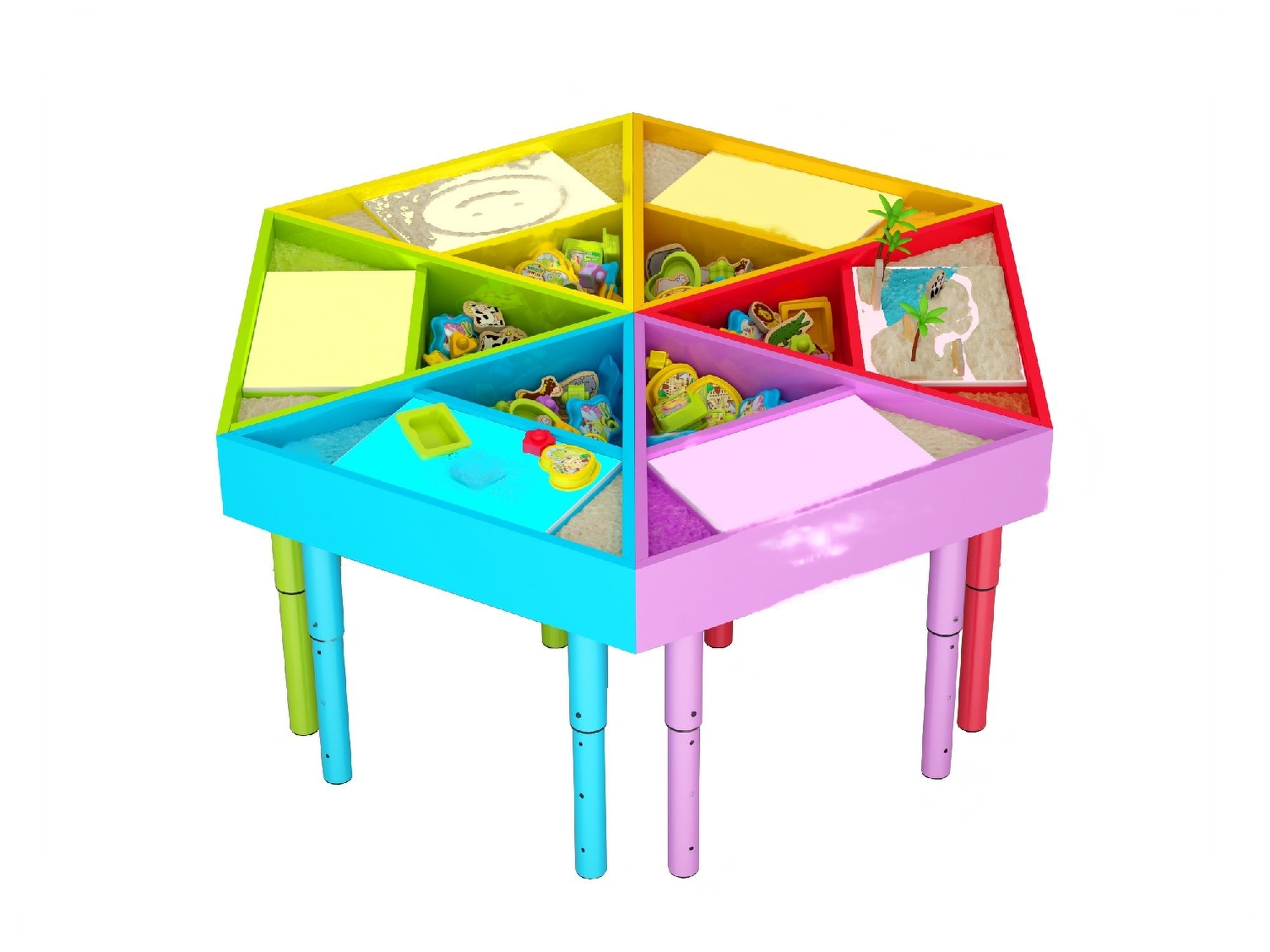 Стол состоит из шести разноцветных треугольных столешниц, оснащенных удобным механизмом регулировки высоты, а также ящиком для хранения. На каждой столешнице расположен планшет с подсветкой, на котором можно рисовать кварцевым песком. Съемная крышка стола оснащена поверхностью для рисования маркерами.
