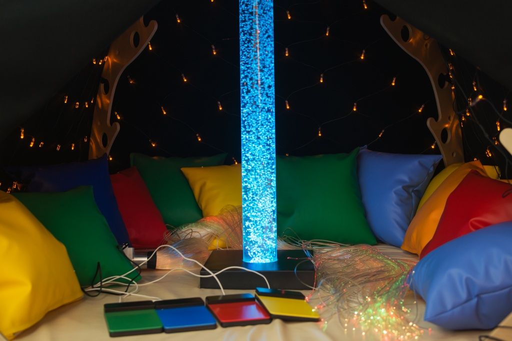 Оснащение сенсорной комнаты в ДОУ может быть не только эффектным, но и уютным. Шатер для отдыха создает ощущение безопасности, в его стенах приятно уединиться и расслабиться, а сопутствующее оборудование поможет дошкольнику в полной мере прочувствовать эффект от пребывания в релакс-зоне.