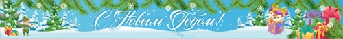 Надпись "С Новым годом!" на цветном фоне украсит крыльцо или стену учреждения. Изображение елок и сказочных персонажей с подарками соответствует праздничной тематике. Прочный влаго- и ветроустойчивый материал подходит для помещений и улицы.