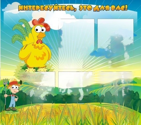 Стенд украшен изображением петуха, фермера и поля, залитого солнцем. В пяти удобных карманах формата А4 можно поместить важную информацию, плакаты, объявления, советы специалистов. Все листы при необходимости могут легко обновляться.