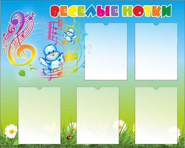 Стенд украшен изображениями цветов, птиц. В специальных карманах можно разместить названия нот, нотный стан, слова песен или информационные плакаты на тему музыки.
