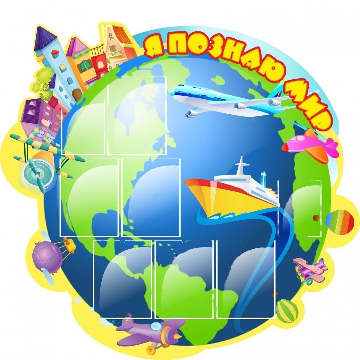 Стенд выполнен в виде земного шара. Для размещения важной и полезной информации предназначены восемь карманов.