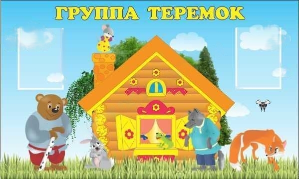 На стенде изображены персонажи мультфильма "Теремок". В вертикальные карманы формата А4 можно поместить списки детей, информацию о занятиях и распорядке дня.