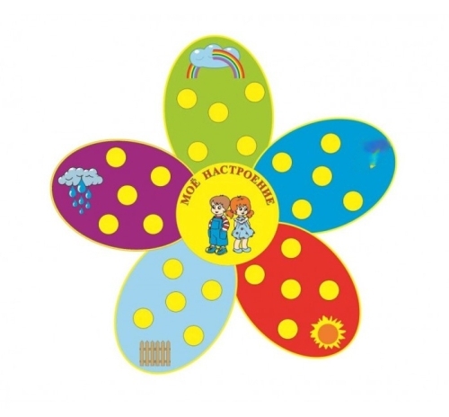 Стенд для уголка настроения представлен в виде цветка. На каждом из лепестков изображен условный знак: радуга, забор, туча, гроза, солнце. При помощи символов ребенок может выразить внутреннее состояние. Панель оснащена 30 магнитными элементами (57х100 мм) каплевидной формы. К ним крепятся фото детей, которые ассоциируют свое настроение с выбранным символом.