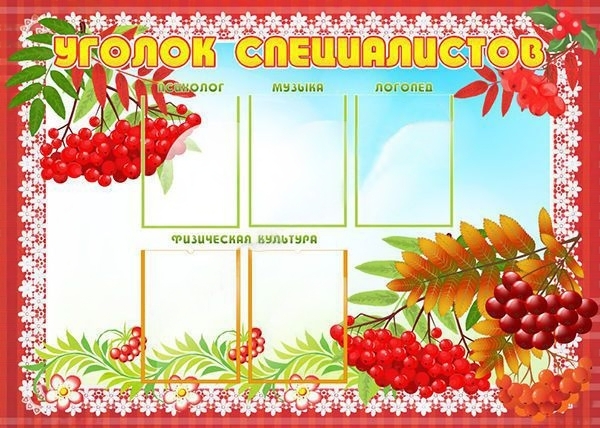 Стенд украшен изображением гроздей рябины. В специальных карманах формата А4 можно разместить важные объявления, плакаты, различные информационные листы, советы и упражнения от логопеда, психолога, учителей музыки и физической культуры.