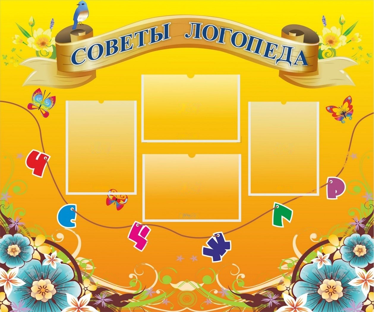 На данном красочном информационном стенде «Советы логопеда» в специальных карманах формата А4 можно разместить различные полезные советы и упражнения по развитию речи для малышей. Такая информация будет очень полезна для родителей, поэтому стенд можно поместить в холле или учебном классе в детском саду.