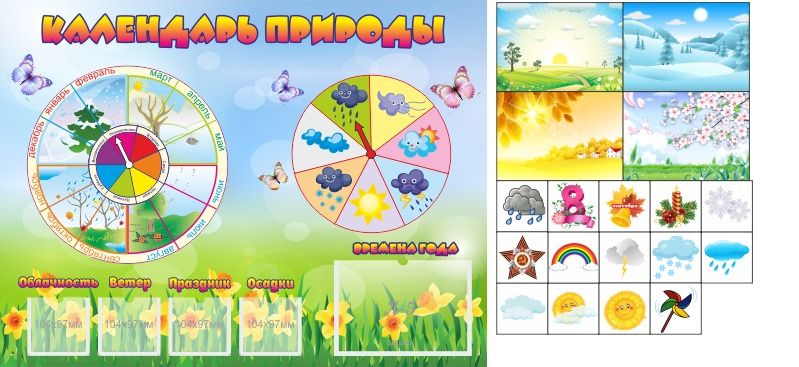 Стенд представляет собой наглядное пособие, которое поможет изучать малышам времена года, месяцы и погоду. Оснащен двумя кругами со стрелками для обозначения времени года, месяца и погоды за окном, а также карманами, в которых можно помещать различные объявления, плакаты и рисунки на тему природы и окружающего мира.