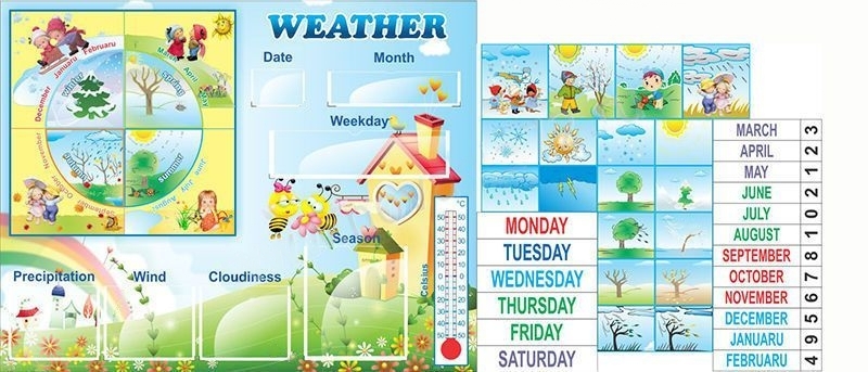 Все надписи выполнены на английском языке. В комплекте со стендом идут карточки с изображением времени года, погоды, названий месяцев, дней недели и числами. Ежедневное заполнение кармашков стенда нужными карточками станет увлекательным занятием для малышей, изучающих английский язык.