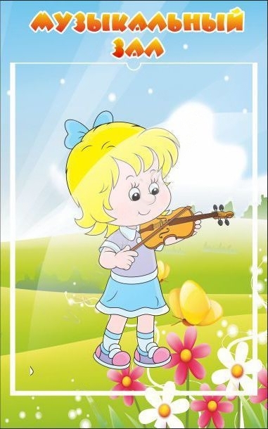 Вывеска украшена изображением девочки, играющей на скрипке. В удобный карман формата А4 можно поместить фотографию и имя педагога или полезные советы, объявления, плакаты на тему музыки.