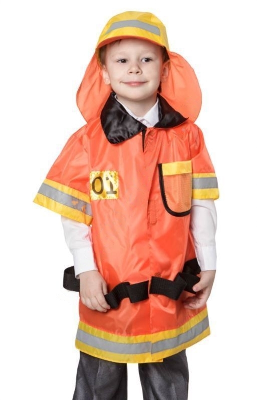 Костюм состоит из шляпы, стилизованной под шлем пожарного, и куртки с карманом и поясом с петлями для инструментов. На шляпе и куртке есть светоотражающие полосы.