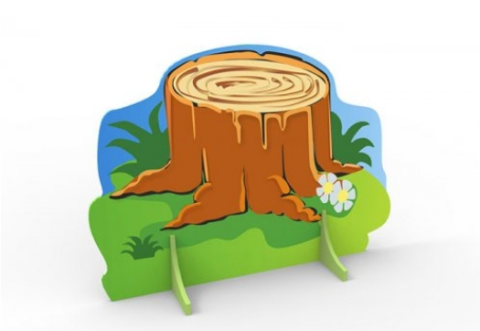 Фигурная панель с изображением пня и ромашек стоит на 2-х опорах. Края компактной панели закругляются. Элемент оформления выполняется из безопасного и прочного материала, который сохраняет целостность на протяжении многих лет.
