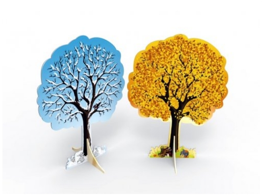 Изделие размещается в ДОУ, прочные подставки не дают резной панели упасть. С 2-х сторон на поверхность из МДФ наносится рисунок: дерево с листвой или без, в теплой и холодной цветовой гамме соответственно. Контуры панели из МДФ закругляются.
