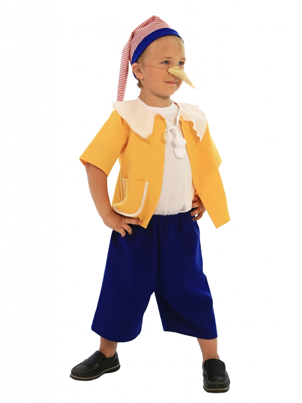 Рубашка украшена белым воротничком, и дополнена пумпонами на завязках. Завершает сказочный образ накладной нос, фиксирующийся посредством резинки.