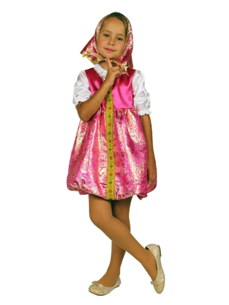 Нарядный сарафан (комбинация розово-золотой парчи с розовым креп-сатином, фасон "тюльпан", отделка жаккардовой тесьмой) дополнен белоснежной рубашкой с присборенными рукавами-фонариками, а также платком, края которого отделаны золотистой бейкой.