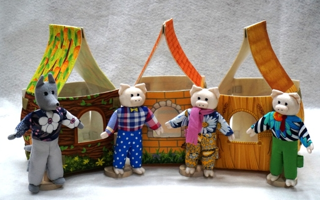 Персонажи одеты в костюмы разного цвета и фактуры. Мягкие куклы дополняются петлями, в которые вставляются пальцы.