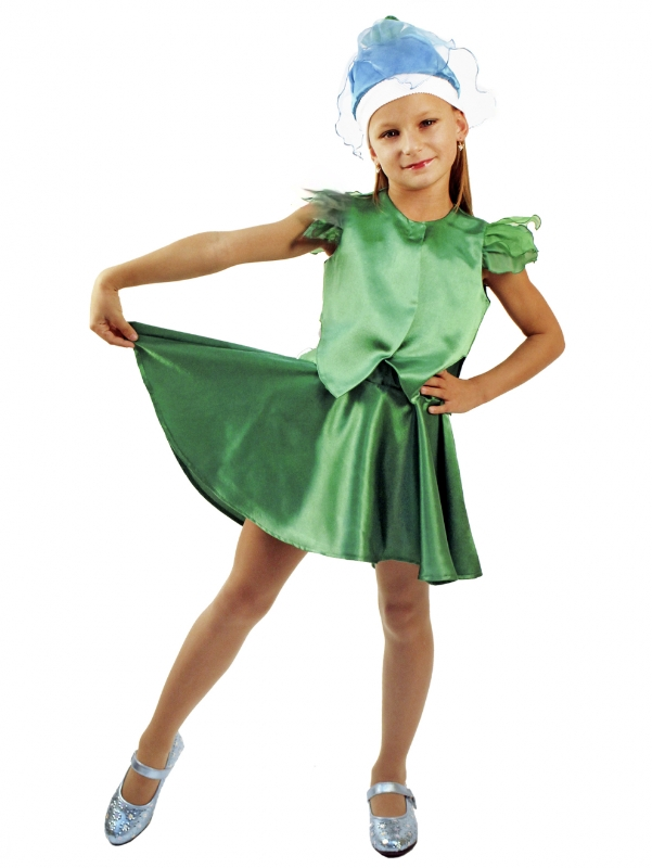 Наряд состоит из жилетки и расклешенной юбки, выполненных из креп-сатина в зеленом цвете. Юбочка по талии присобрана на резинку. Жилет спереди застегивается при помощи липучек, рукава украшены лоскутами ткани, имитирующими лепестки. Дополняет цветочный образ обтягивающая шапочка, которая выполнена по мотивам цветка.