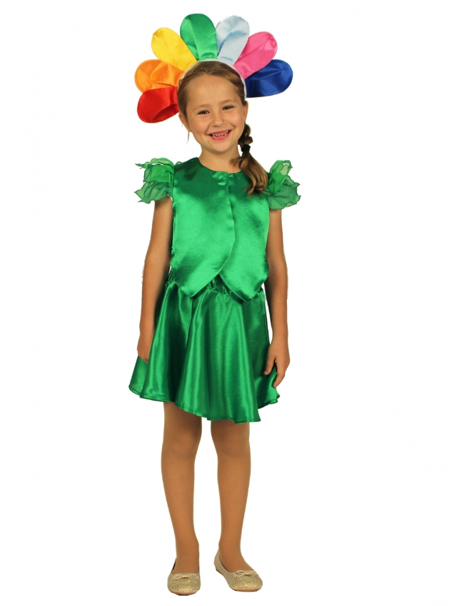 Наряд состоит из жилета и расклешенной юбочки, выполненных из креп-сатина в зеленом цвете. Жилет спереди застегивается при помощи липучек, рукава украшены лоскутами ткани, напоминающие листья. Юбка по талии присобрана резинкой. Дополняет образ сказочного растения разноцветный ободок, выполненный в виде лепестков.