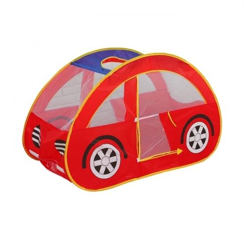 Детская палатка выполнена в форме автомобиля с дверцами на липучках. Дугообразная крыша оснащена люком: отверстием в тканевом элементе. С каждой стороны конструкции есть прозрачные вставки.