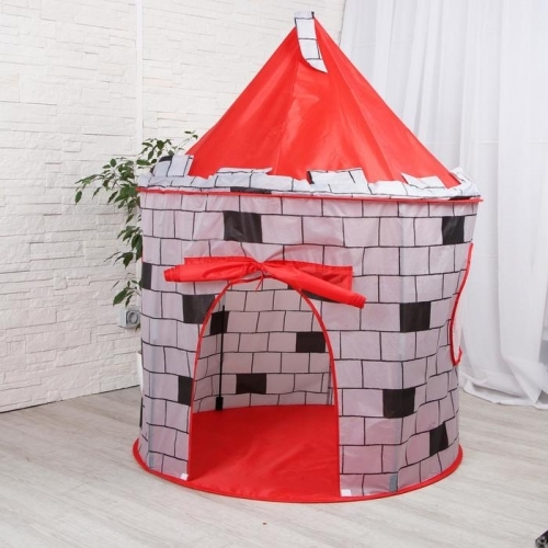 Детская палатка подходит для игры на улице или помещении. Складной чехол в расправленном состоянии приобретает форму цилиндра с конусом наверху. Есть прозрачные вставки – окна. Дверь, как и остальные элементы, выполнена из текстиля. Ее можно скатать в рулон, закрепить веревкой над входной аркой.