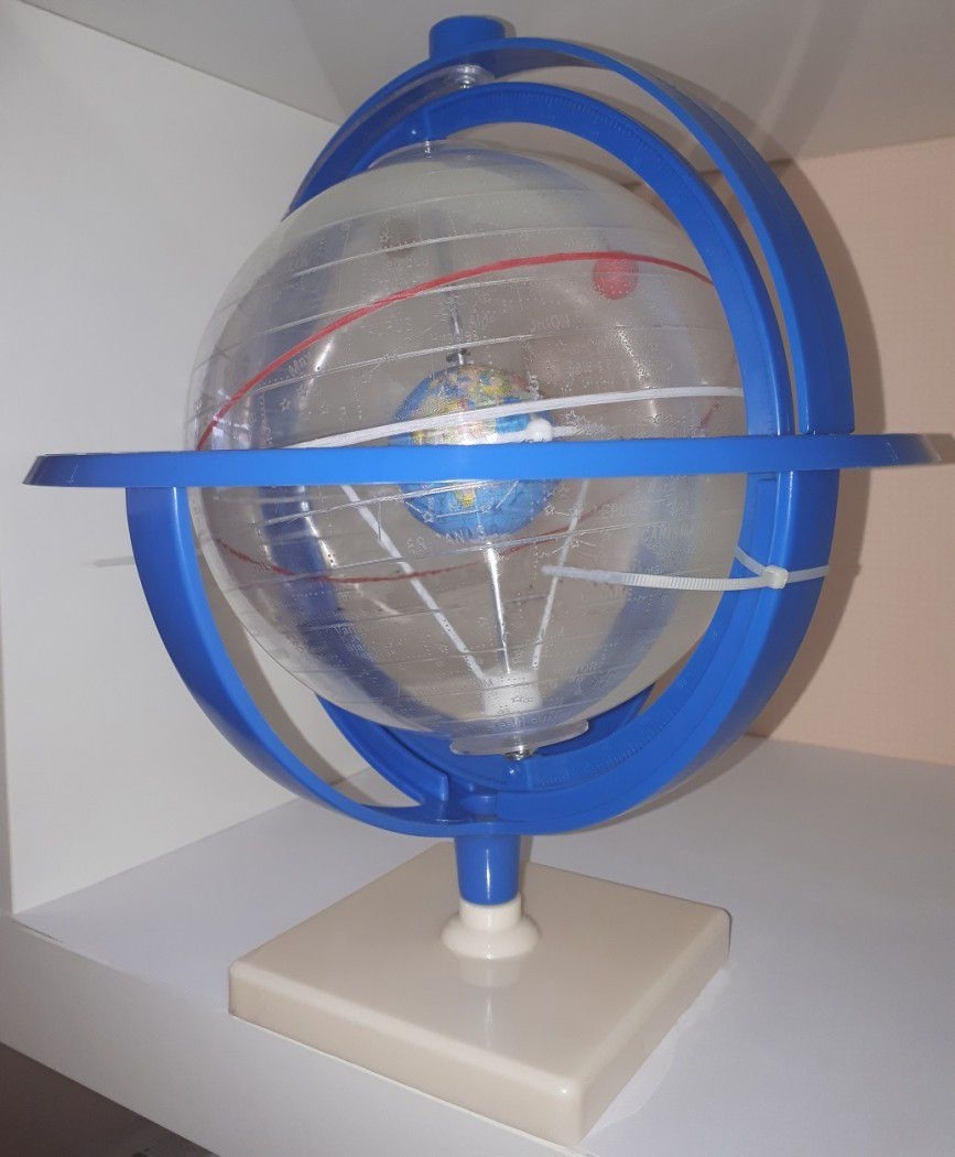 Модель позволяет имитировать суточное вращение светил. Внутри сферы проходит красная линия для отображения перемещений Солнца за год.
