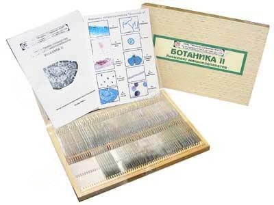 Снабжен экспликацией на русском и английском языках. При необходимости препараты окрашены, что делает их детали более контрастными. Комплект содержит методические рекомендации по проведению лабораторных работ, снабженные иллюстрациями, на которых показано, какие детали препарата можно рассмотреть, и какое увеличение рекомендуется для этого использовать.
