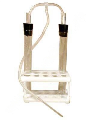 Пробирки устанавливаются в штативе и закрываются пробками, в которые вставлены стеклянные трубки: короткая и длинная. Короткая пробка заканчивается под пробкой, длинная- немного не доходит до конца пробирки. Короткая трубка одной пробирки и длинная другой посредством тройника соединены с пластиковой трубкой.