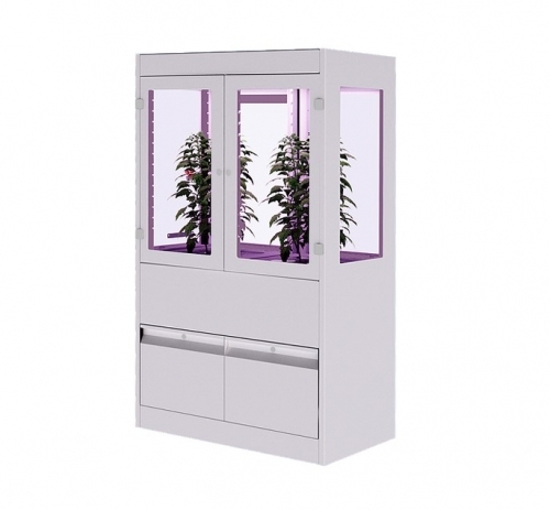 Водяной туман от распылителя подается в камеру вентилятором. Есть контроллер с часами и дисплеем на 4 строки по 20 символов. Пользователь вводит время искусственного заката и рассвета, выбирает спектр освещения (глубокий красный, красный, синий или ультрафиолет), задает периодичность работы насоса, компрессора. Высота светильника меняется. Есть искусственный обдув растений (имитация ветра).