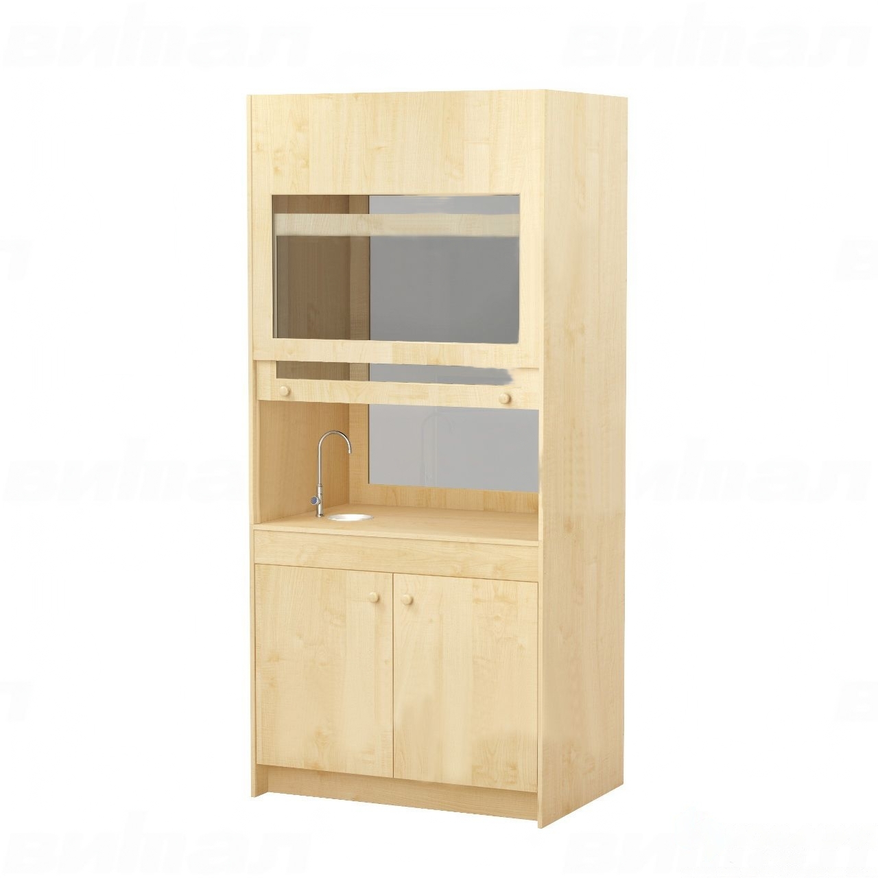 Вытяжной шкаф для школы оснащен водоразборной колонкой (краном), раковиной, тумбой с двумя дверцами и полкой внутри для хранения препаратов и инструментов. Используется в специализированных кабинетах, где проводятся лабораторные работы. Столешница изготовлена из ДСП с пластиковым покрытием, передний торец отделан противоударной кромкой.
