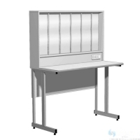 - 6 стоек для бюреток, 3 выдвижных ящика и 1 ящик с дверцей под столешницей, 2 рабочие зоны, размеры (ШхГхВ) - 1800х600х750-1500 мм.