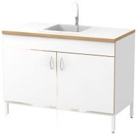Инвентарь хранится в тумбе с распашными дверцами. Поверхности из ДСП с термостойким пластиком не боятся влаги и химических веществ.