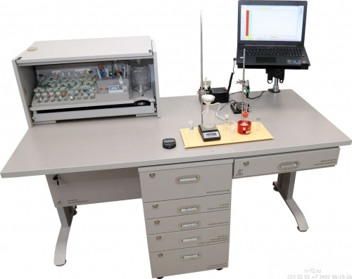 В настольной тумбе: Выдвижной ящик со стеклянной посудой. Инструменты и принадлежности. Набор флаконов для хранения реактивов в виде жидкостей, порошков и гранул. Бутыль Вульфа (1 л). Лоток.