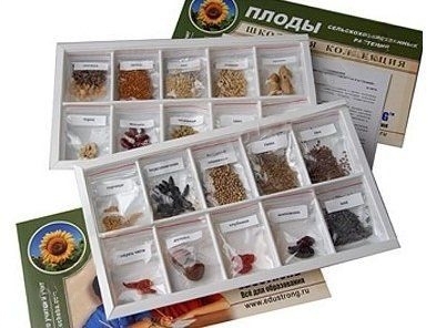 В коллекции представлены образцы сухих и сочных плодов, сопровождаемые натурными фотографиями растений и схематичными рисунками строения плодов.