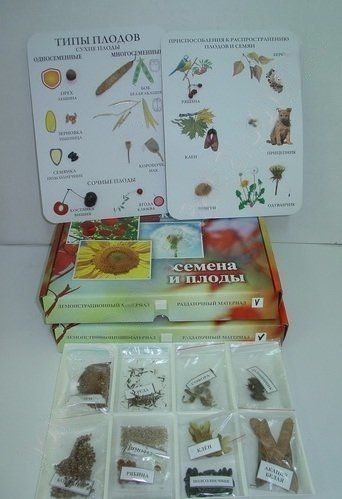 Вторая часть включает раздаточный материал - десять видов различных семян и плодов, которые упакованы в пакеты с подписями. Позволяет определить тип плодов и степень приспособленности к распространению.