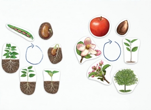Набор иллюстративного материала позволяет проследить за развитием 2-х видов растений: бобовые и яблоня. На крупных магнитах для доски изображены стадии роста, созревания.