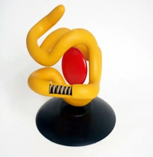 На модели представлена глобула в виде толстого жгута, который сплетен в клубок. При этом вырезана его небольшая часть, которая имитирует нить аминокислот. На этом участке представлена вторичная структура белка в виде спирали. Между витками жгута размещается круглый красный диск - гем.