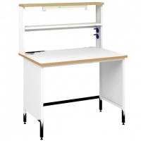 Столешница изготовлена из ДСП с термостойким пластиком. Материал готов к воздействию влаги и химических веществ. Поверхность термически и химически стойкая. Рабочее место дополнено пристенным стеллажом с горизонтальной полкой, светильником и 2-мя розетками. Вмонтирован выключатель. Розетки (220 В) защищены от брызг. Освещение люминесцентное, 18 Ватт.