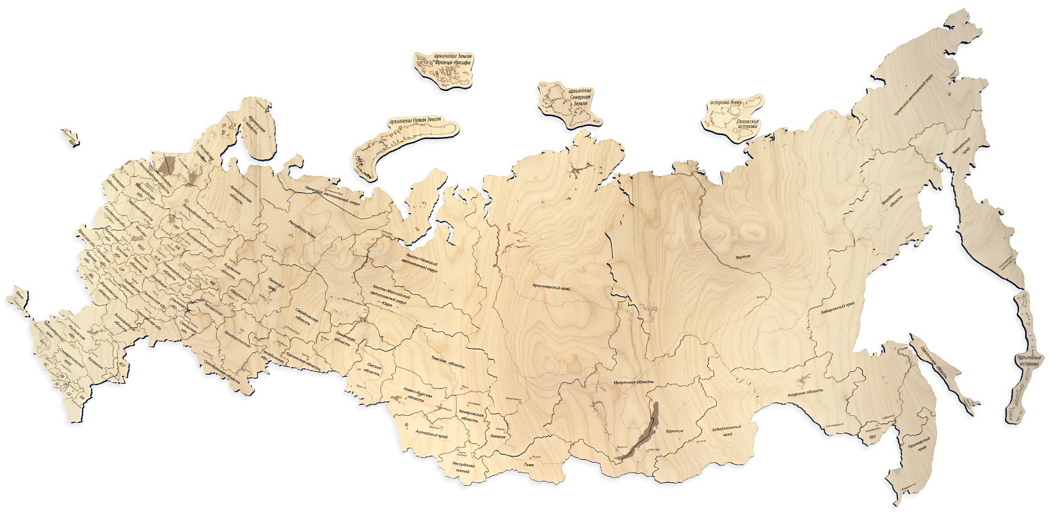 Фигурная карта России составляется из деревянных пазлов. Настенная конструкция украсит кабинет географии. Отшлифованные элементы соединены в очертания страны с границами областей, обозначениями и названиями крупных городов на русском языке. Дополнительно закрепляется изображение компаса для определения сторон света.