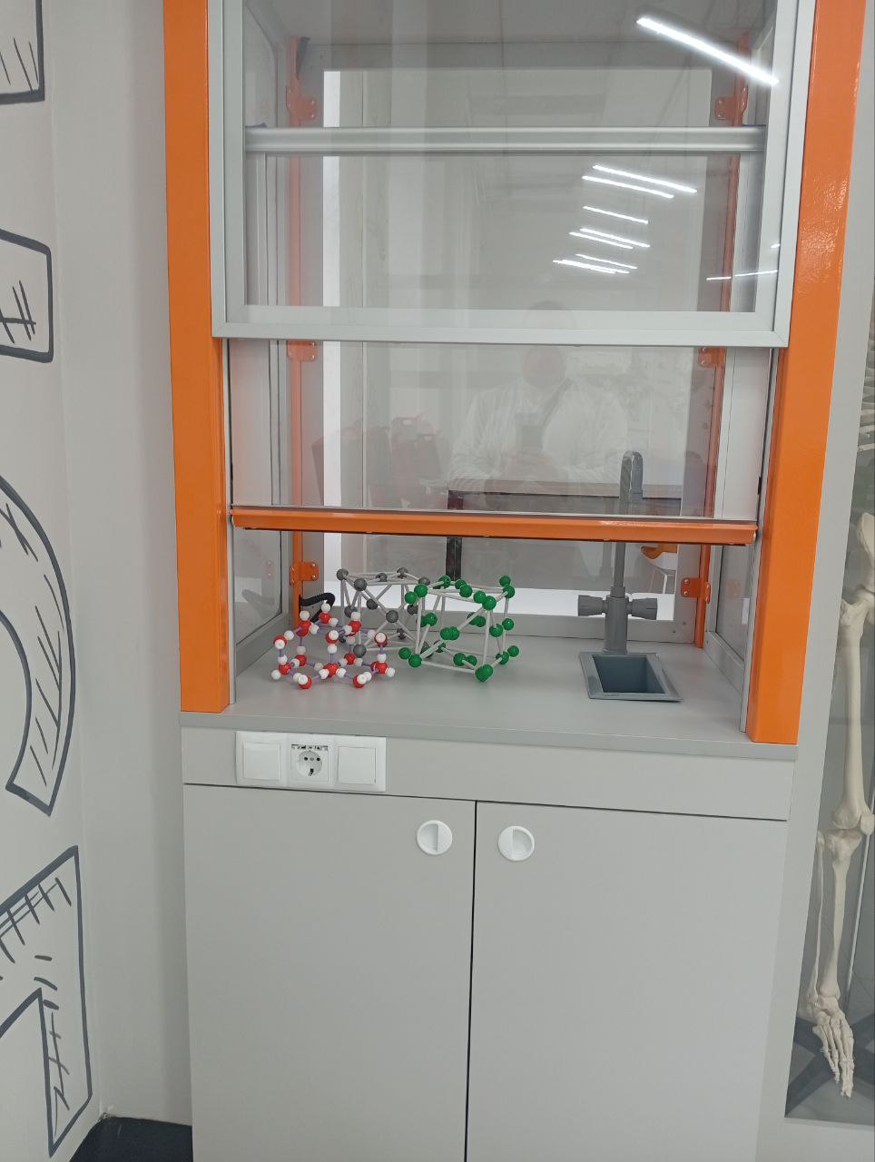 В верхней части хим.стойкая столешница, в которую установлена мойка, изготовленная из полиуретана, и смеситель.
