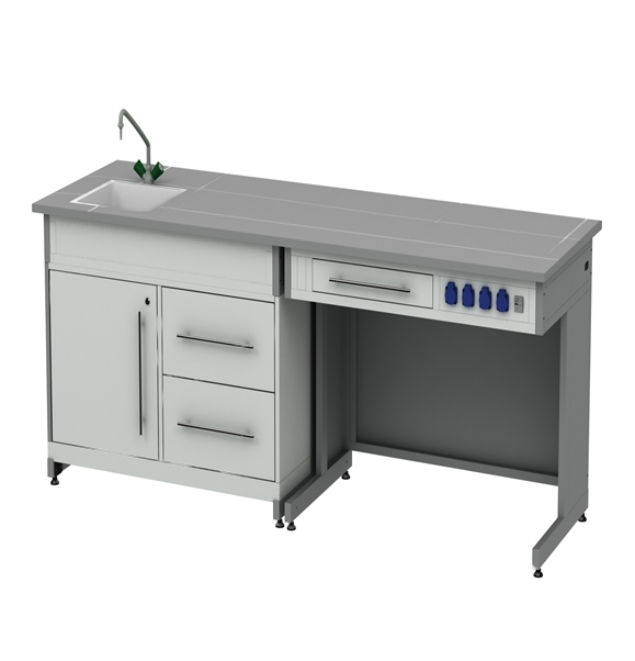 Сварной каркас выполнен из стальных труб. Столешница из ЛДСП покрыта керамической плиткой. Под рабочей поверхностью с правой стороны размещены 4 розетки (220 В и 42 В, по 2 шт.). Вмонтировано устройство защитного отключения. Рядом находится выдвижной ящик для наглядных пособий.