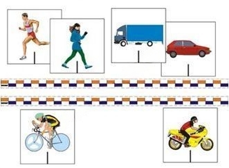 Пособие крепится на классную доску магнитными кнопками. Карточки с изображениями людей и транспортных средств также снабжены магнитами, что позволяет легко крепить их и передвигать по доске. На лицевой стороне карточки нанесена прямая, предназначенная для совмещения со штрихами разметки.