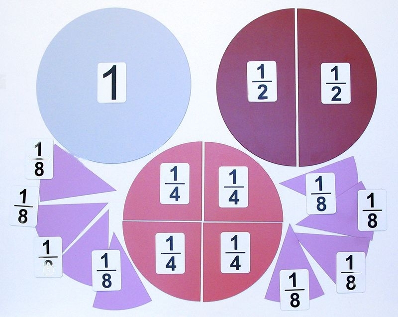 В наборе 30 магнитных карточек: 15 цветных в виде равных частей круга и 15 белых с указанием величины дроби от 1 до 1/8. Предназначен для наглядного изучения темы “Дроби”. Подходит для магнитной доски.