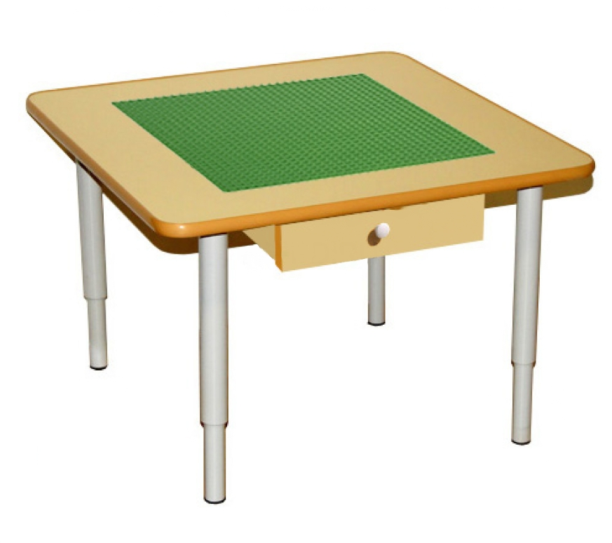Столешница выполнена из ЛДСП, торцы обработаны противоударной кромкой ПВХ. По центру установлено квадратное панно (размер 400х400 мм) для крепления фигур Лего DUPLO. Механизм регулировки опор позволяет конструкции подстраиваться под рост ребенка.