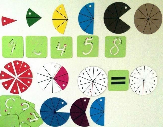 В набор входят карточки в виде равных частей круга, а также карточки с числами от 0 до 9.