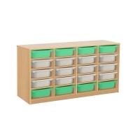 Горизонтальный стеллаж состоит из 4-х вместительных отсеков, которые оборудованы выдвижными контейнерами. На выбор предлагается 2 вида: малые (размер 295х395х140 мм) и большие (295х395х200 мм).