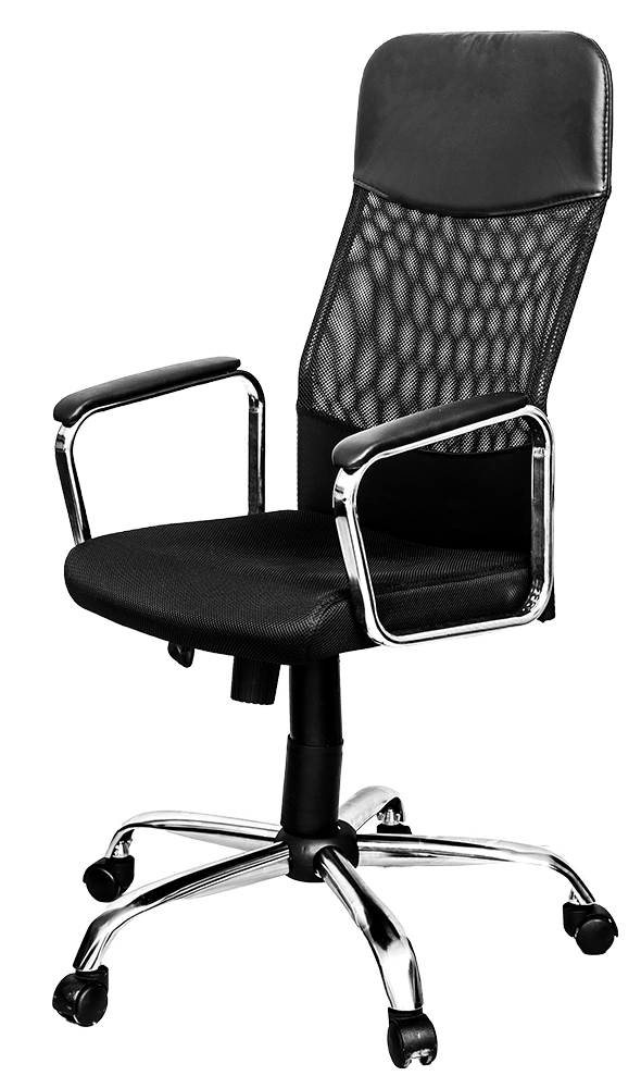 Высота сиденья меняется при помощи рычага. Наклон изогнутой спинки регулируется винтом. Металлические подлокотники дополнены мягкими накладками. Хромированное пятилучье оснащено колесами из пластика. Обивка комбинированная. Изголовье и нижняя часть спинки покрыты экокожей, устойчивой к износу. Центральная часть выполнена из сетчатой ткани. Прочный материал не электризуется и пропускает воздух. Остальные части ложа обтянуты многослойным композитом.